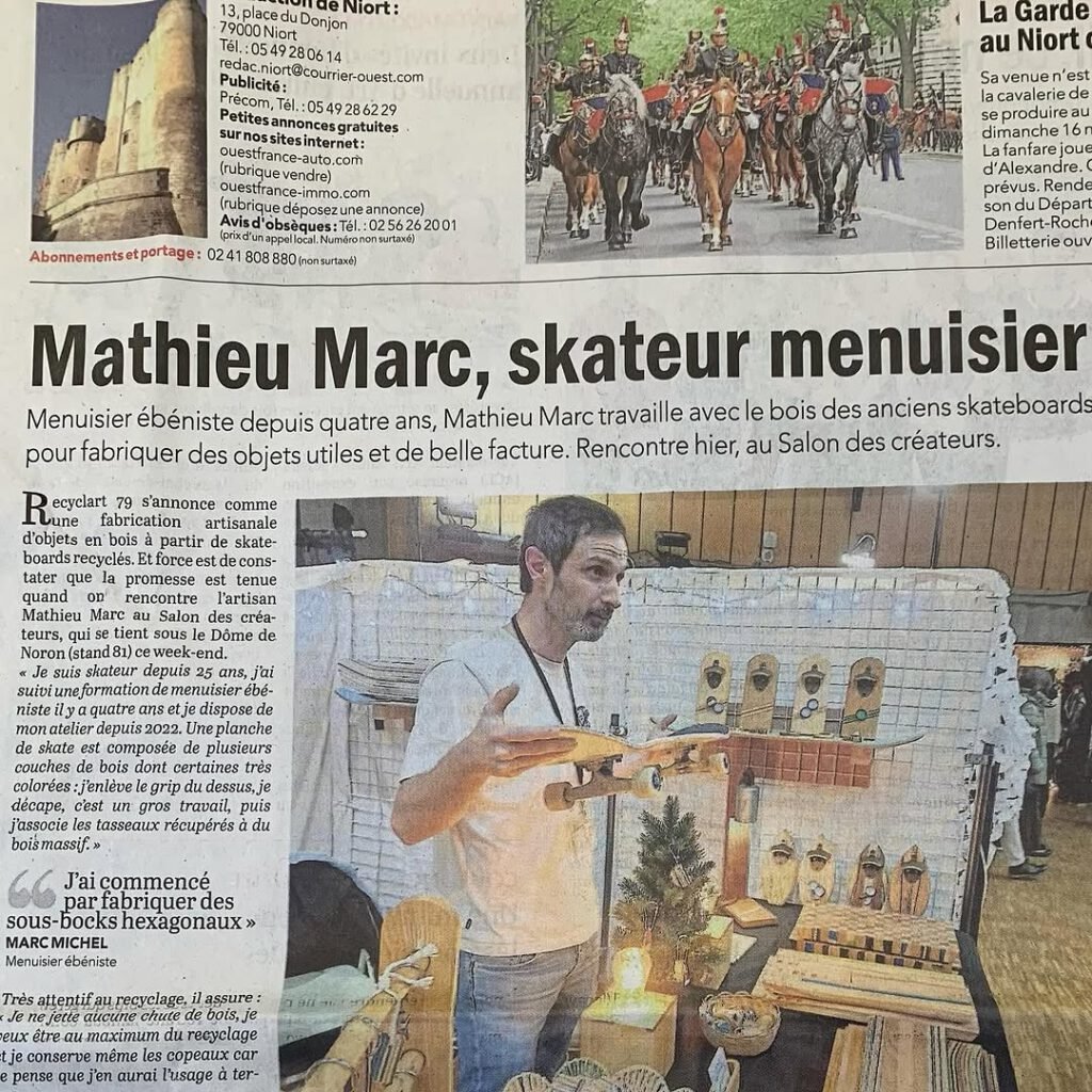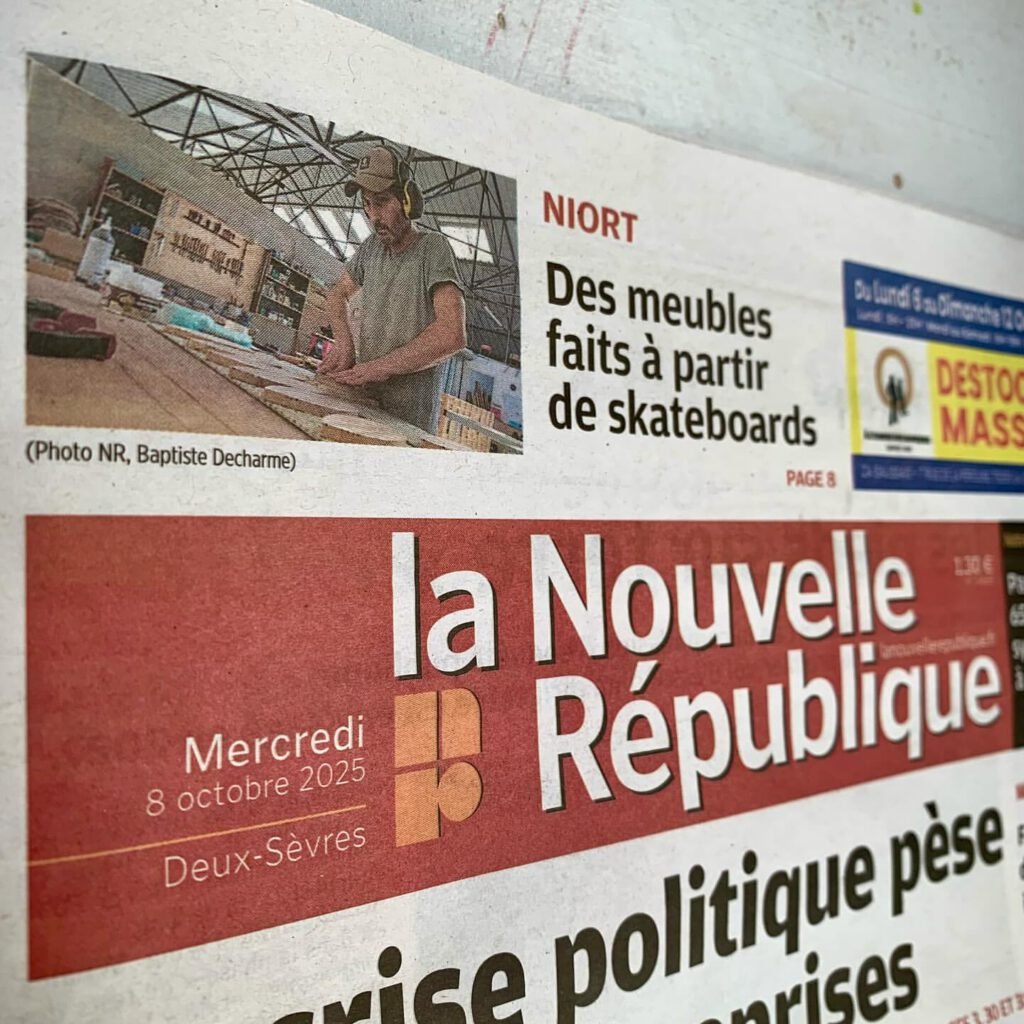 Recyclart 79 accompagne des projets concrets: meuble sur mesure, restauration de pièce ancienne, aménagement intérieur et objets personnalisés. Le skateboard recyclé intervient comme signature de matière, en détail ou sur des pièces complètes.